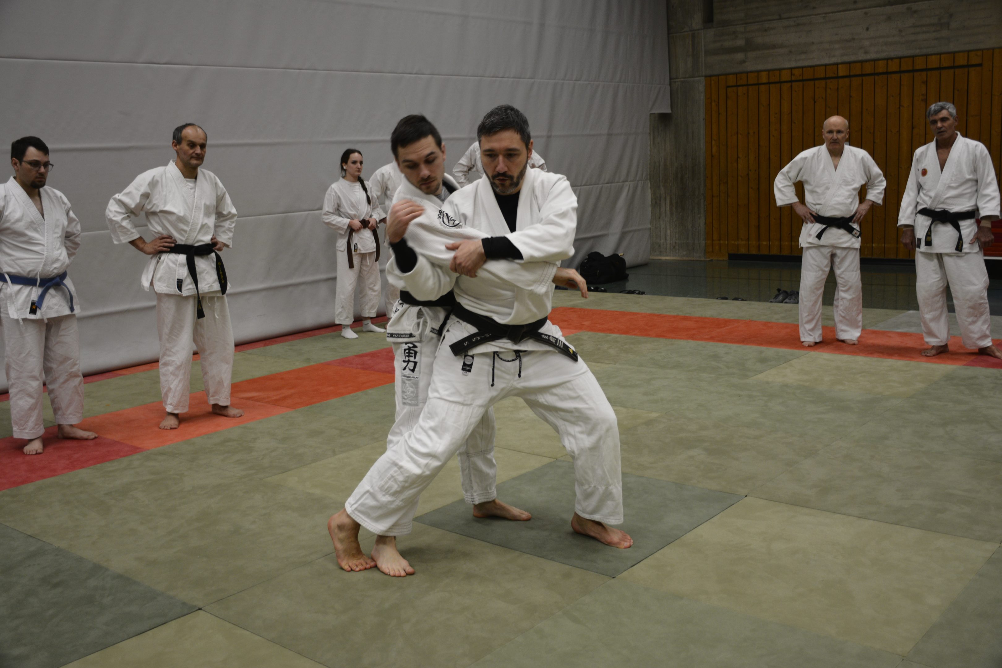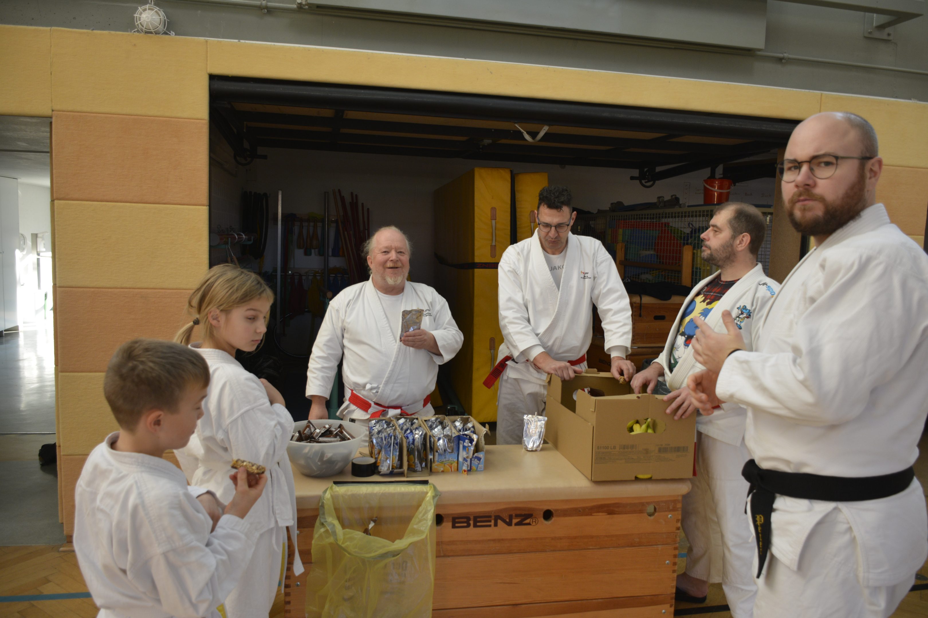 Bei den „Großen“ ging es ebenfalls sehr konzentriert zur Sache, wobei auch hier natürlich der Spaß nicht zu kurz kam. Bei Matthias standen Wurftechniken auf dem Programm. Er zeigte gürtelgradspezifisch unterschiedliche Varianten, wobei präzise Eingänge, stabile Positionen und kontrollierte Abläufe im Mittelpunkt standen. Auf der anderen Matte trainierte Stefan im Bereich der Waffenabwehr. Er erarbeitete technische Grundlagen wie Distanz und Timing bevor die Gruppe bei der Pratzenarbeit nochmal ins Schwitzen kam. Am Nachmittag tauschten die Gruppen die Themen und Referenten, so dass jeder in den Genuss kam, das komplette Programm des Tages zu erleben.
